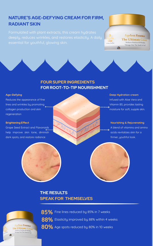 Discover the ultimate skincare solution with DermaChic Ageless Essence – The Ultimate Cream, a luxurious anti-ageing cream specially formulated to fight visible signs of aging while nourishing and revitalizing your skin. Combining advanced scientific research with the power of natural extracts, this multi-functional cream delivers intense hydration, restores elasticity, and smooths the appearance of fine lines and wrinkles, leaving your skin radiant and youthful.Key Benefits:
